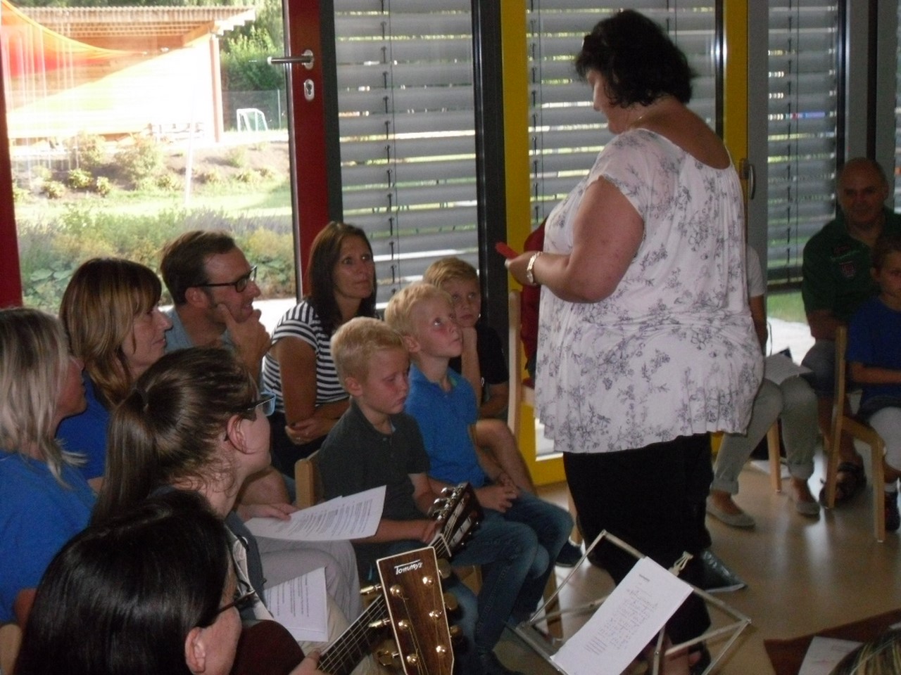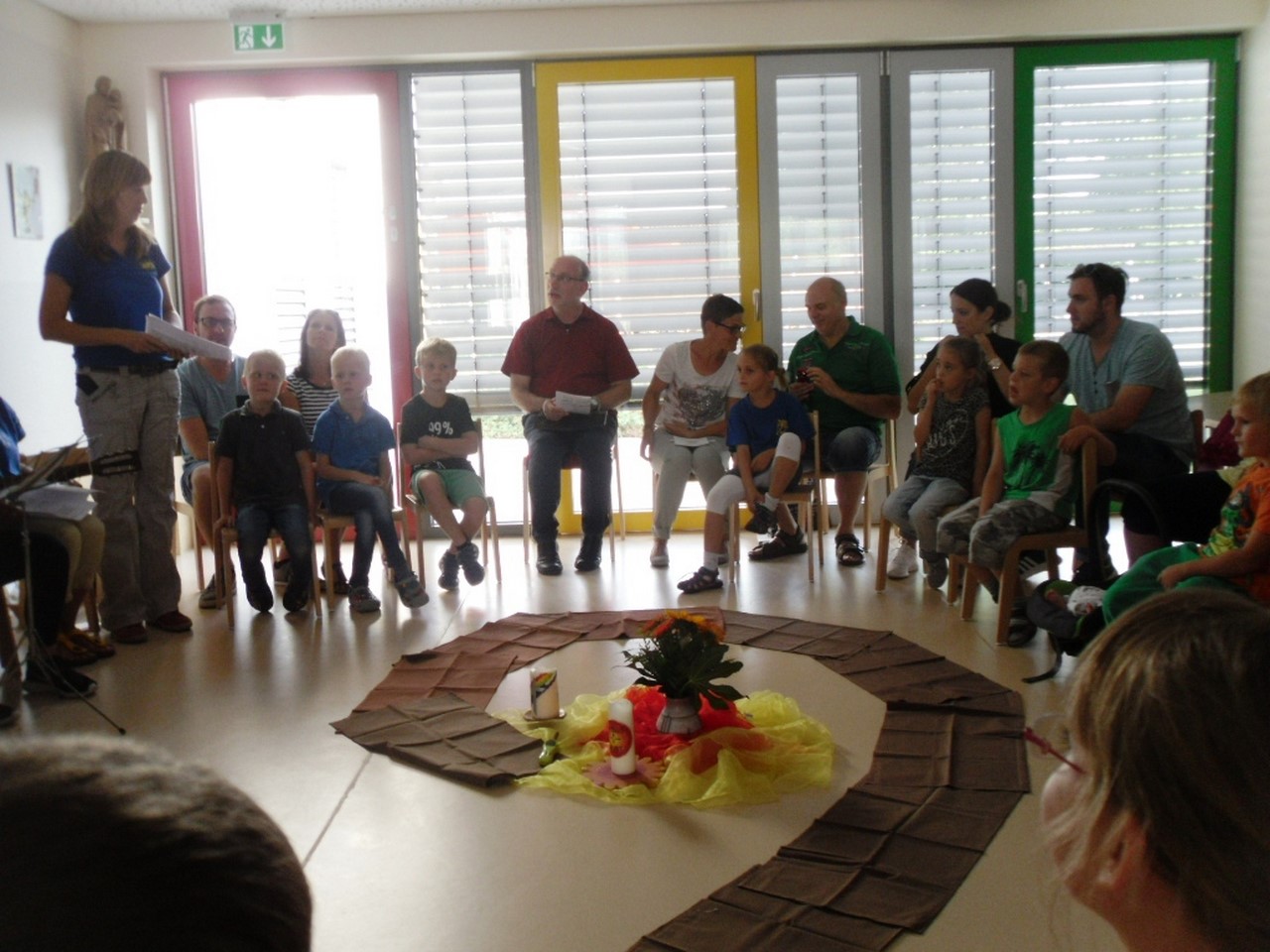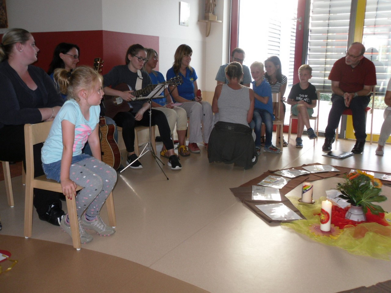 Die anschließenden Fürbitten wurden von Eltern, Erzieherinnen und einem Kind vorgetragen. Der dazwischen gesungene Fürbitt – Ruf „Geh mit uns auf unsern Weg“ passte auch zum gebeteten „Vater unser“.