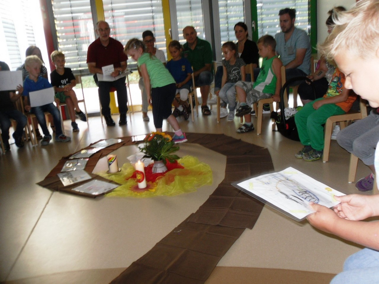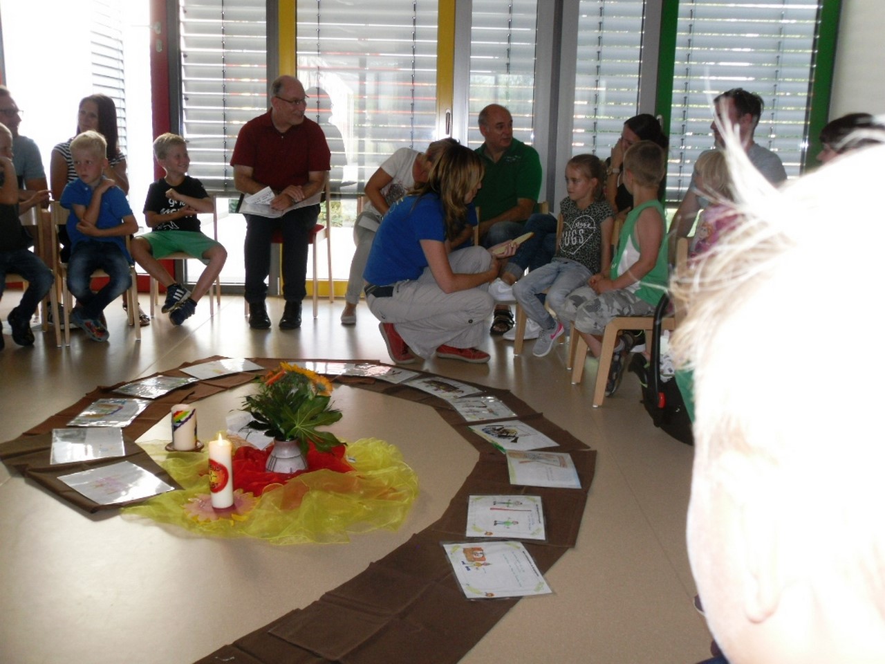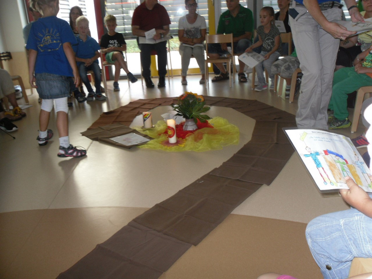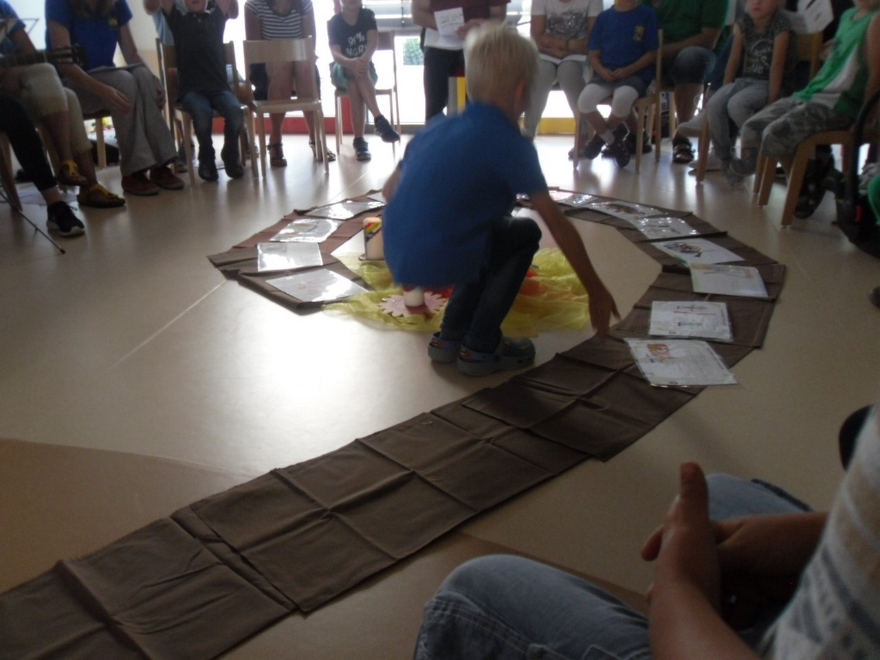 Die Antworten darauf wurden von den Kindern auf den Weg gelegt, der von der Kreismitte aus wie eine Spirale hin zum Ausgang führte und symbolisch verdeutlichte, dass der (Lebens)Weg nun weitergeht; weg vom vertrauten Kindergarten hin zu etwas Neuem – der unbekannten Schule.