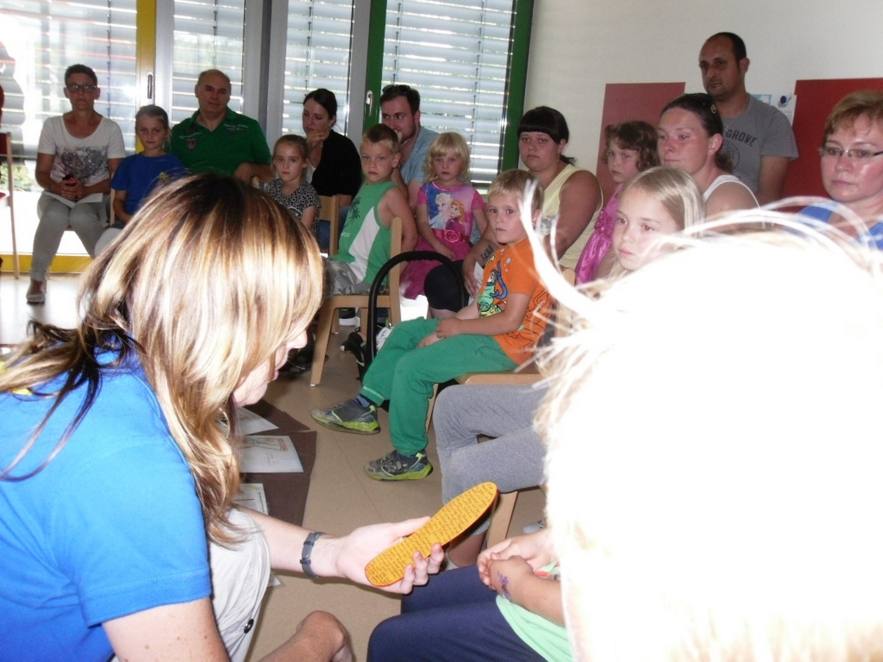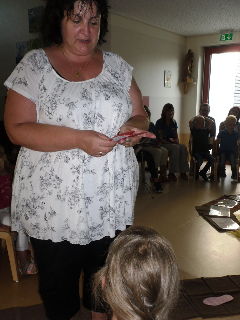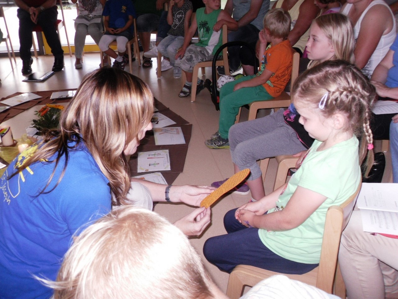 In der Vorbereitung darauf hatte jedes Kind gemalt, was es im Kindergarten am liebsten gemacht hat; die Erzieherinnen haben auf Fußabdrücke geschrieben, welche Spuren jedes Kind bei ihnen hinterlassen hat und was es so einmalig macht.